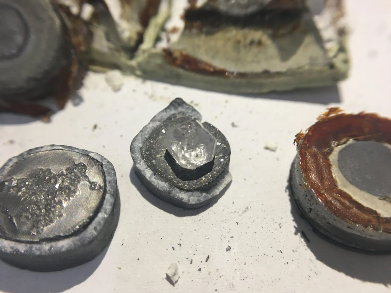 Sous ces conditions intenses, une transformation remarquable se produit. Les atomes de carbone commencent à se réorganiser. Ils se lient à nouveau, atome après atome, cristallisant autour d’un germe de diamant. Lentement, silencieusement, une nouvelle gemme prend forme.